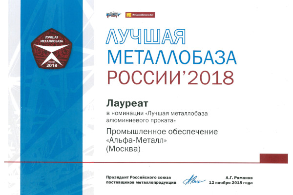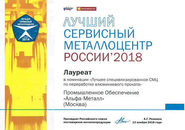 ООО "Производственное объединение "Альфа-Металл" было признано победителем учреждённых Российским союзом поставщиков металлопродукции конкурсов сразу в нескольких основных номинациях. Так, наша компания вновь признана одной из лучших специализированных сервисных металлоцентров по переработке алюминиевого проката среди других 118 объектов, в том числе 63 складских комплексов, 29 сервисных центров и 26 компаний, организовавших свою деятельность в виде сбытовой сети. Кроме того, мы заслужили высокое и престижное звание Лауреата в Конкурсе "Лучшая металлобаза России" и Диплом "за высокопрофессиональную организацию продвижения продукции и услуг". Еще один ценный приз, как Лучшая металлобаза алюминиевого проката, "Альфа-Металл" завоевала в отраслевом разрезе.