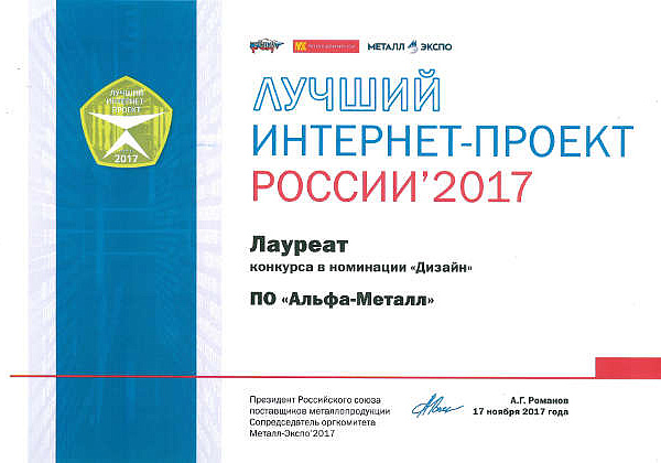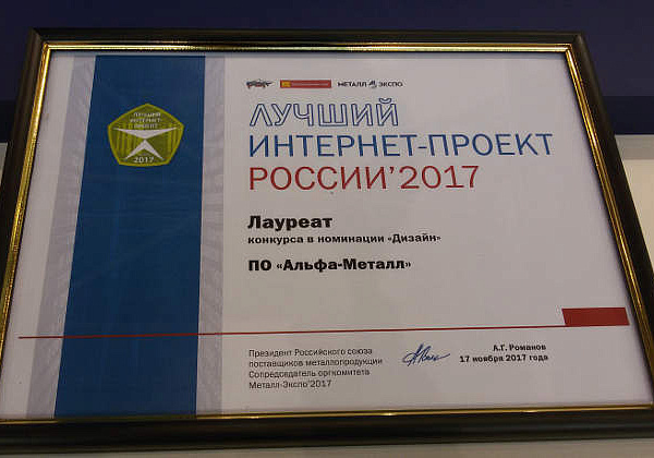 Званием лауреата и Дипломом "За лучший дизайн корпоративного сайта" было отмечено ООО "Производственное объединение "АЛЬФА-МЕТАЛЛ". Таким образом, были оценены высокие успехи компании, связанные с грамотным использованием на службе маркетинга современных IT-технологий.