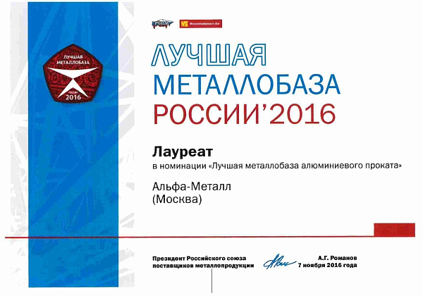 - лауреат конкурса «Лучшая металлобаза России 2016» в номинации "Лучшая металлобаза алюминиевого проката".