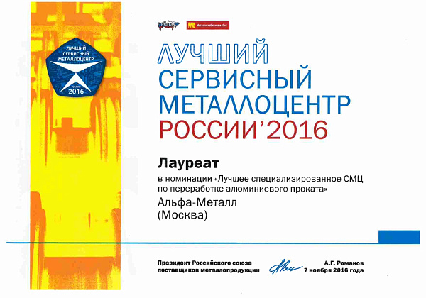 - «Лучшее специализированное СМЦ по переработке алюминиевого проката» в рамках престижного конкурса «Лучший сервисный металлоцентр России 2016»;