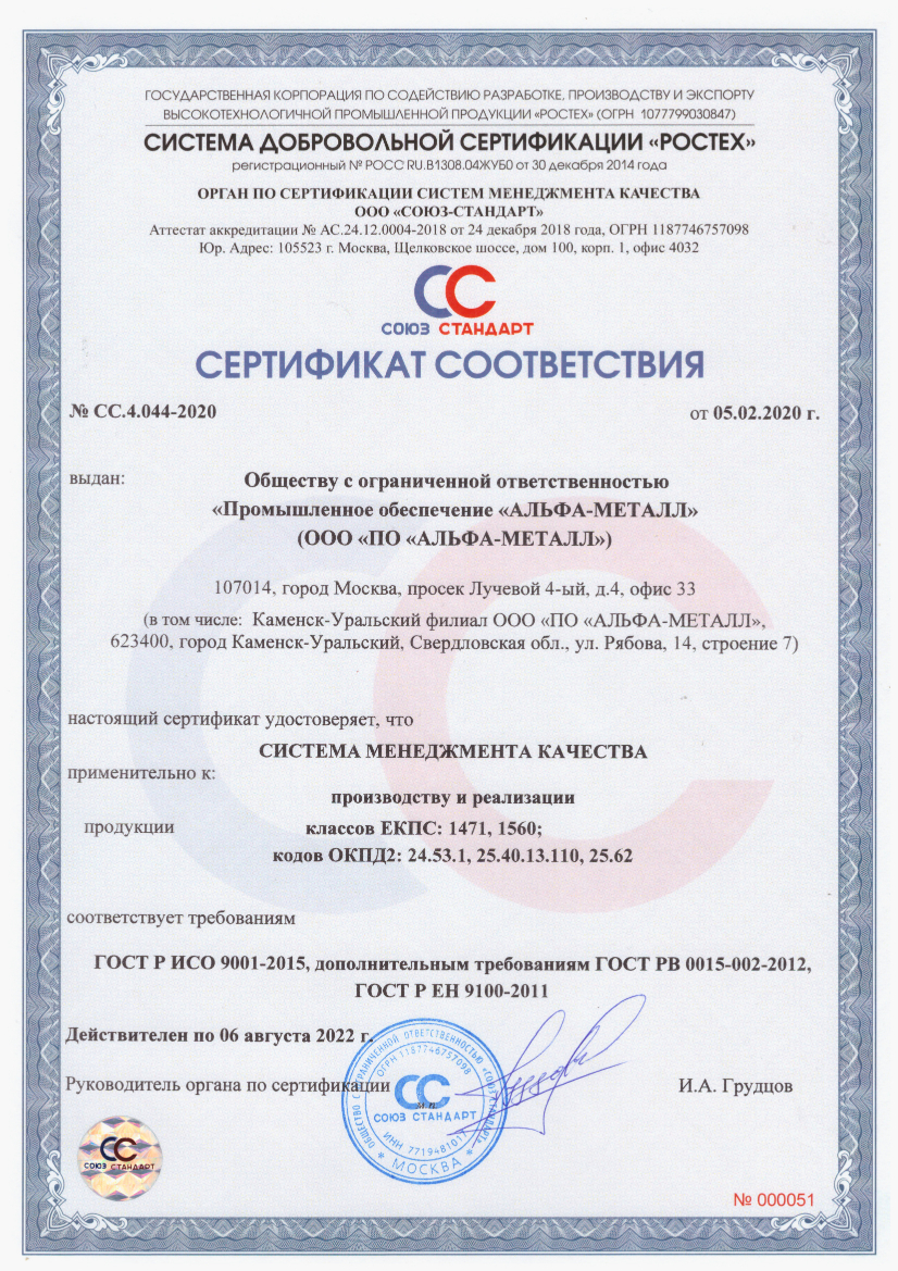 Компания АЛЬФА-МЕТАЛЛ успешно прошла сертификацию системы менеджмента качества по стандарту ГОСТ Р ИСО 9001-2015,ГОСТ РВ 0015-002-2012 и ГОСТ Р ЕН 9100-2011. Сертификат подтверждает систему менеджмента качества работ и услуг в области вооружения и военной техники и подтверждает способность организации соблюдать установленные требования международных и российских стандартов ГОСТ РВ 0015-002-2012 и ГОСТ Р ЕН 9100-2011 для авиационной, космической и оборонной отраслей промышленности.